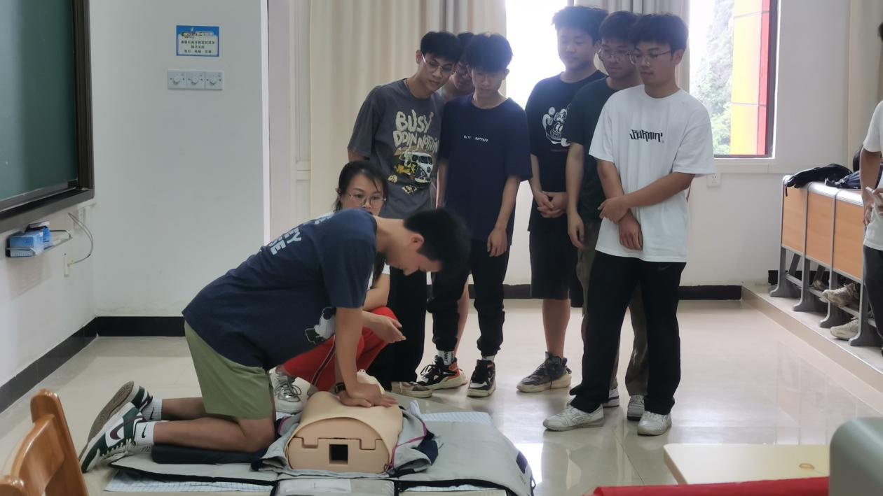 讲座过程中,专家们以理论和实践相结合的方式,讲授了突发意识丧失、气道异物梗阻和心脏骤停等危急情况的现场急救要点。通过两名急诊科医护人员进行模拟演练,“一对一”“手把手”教现场的同学们进行实操,使现场百余名学生快速掌握基本要领。部分学生代表在医护人员的详细指导下进行了实训操作,准确完成了救护动作。