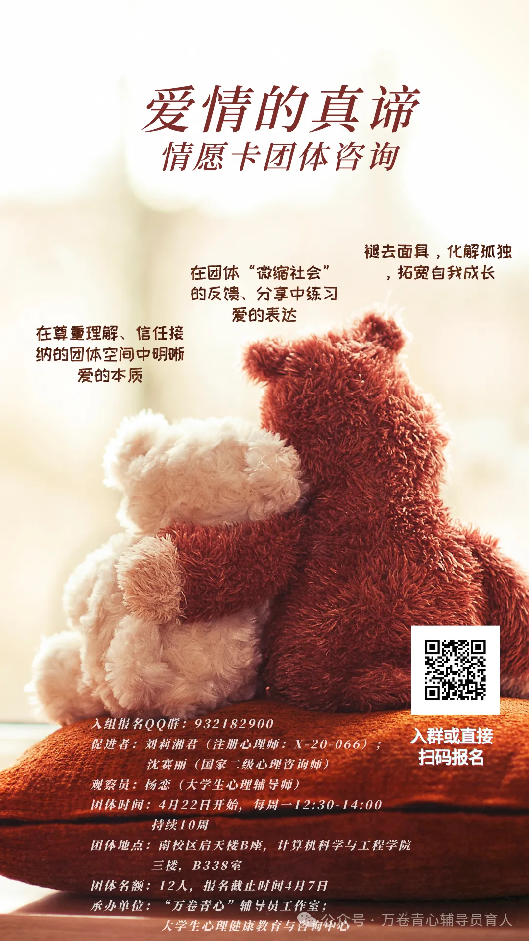 那些在爱情中反复受挫的人、不知如何表达爱意的人、总是陷入矛盾和争吵的人、想获得爱情却没有勇气开始的人、因精神空虚而感到痛苦的人、很难交到亲密朋友的人……都会在本团体中获得安慰、勇气和爱的方法。