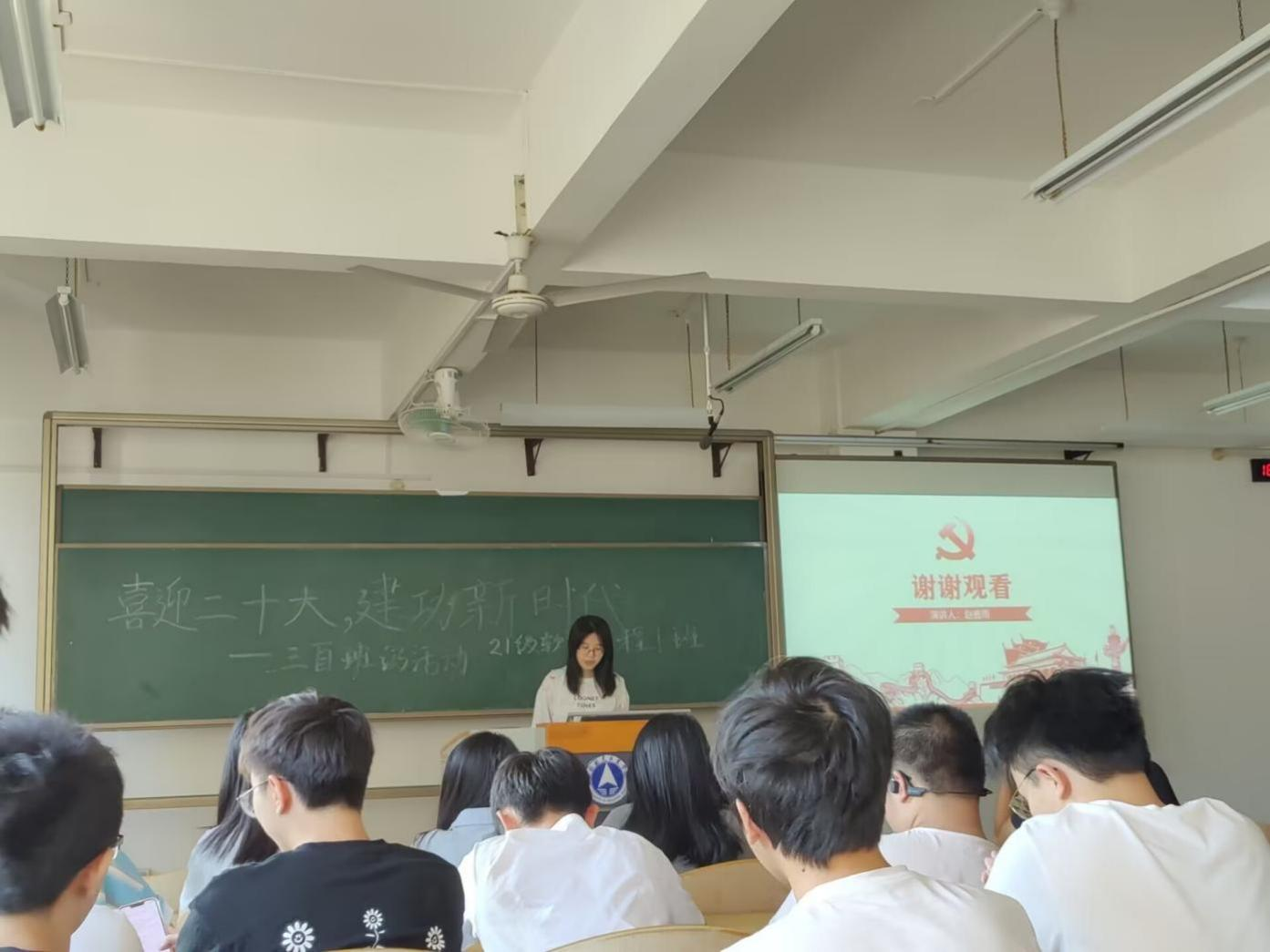 “青年强,则国家强”,恰逢党的二十大胜利召开,2021级软件工程1班为喜迎二十大、积极落实我院“三自班级”学风建设方案于10月16日晚7:00在飞天楼213教室开展“喜迎二十大,建功新时代”主题班会,辅导员杨恋、班主任秦懿恬参会。